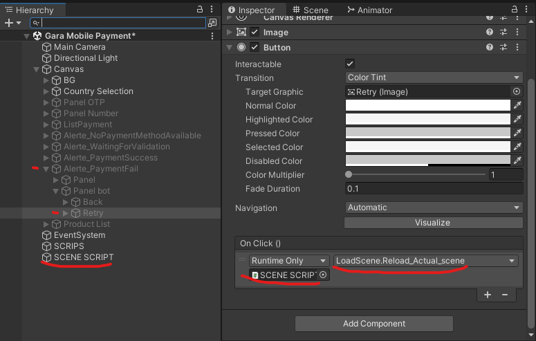 Open the panel: Alerte_PaymentFail then assign the function Reload_Actual_scene() to the Retry button. signup image