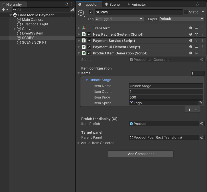 To load the payment scene, you need to create a “LoadScene” script that will: